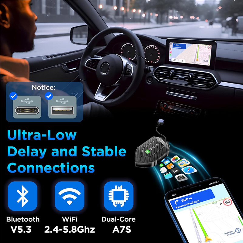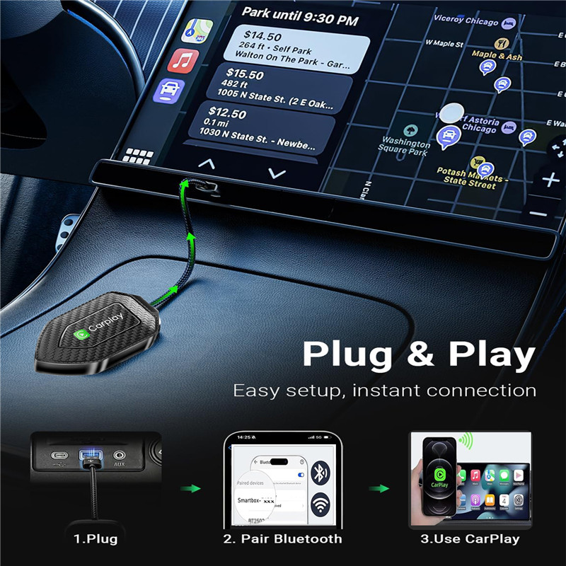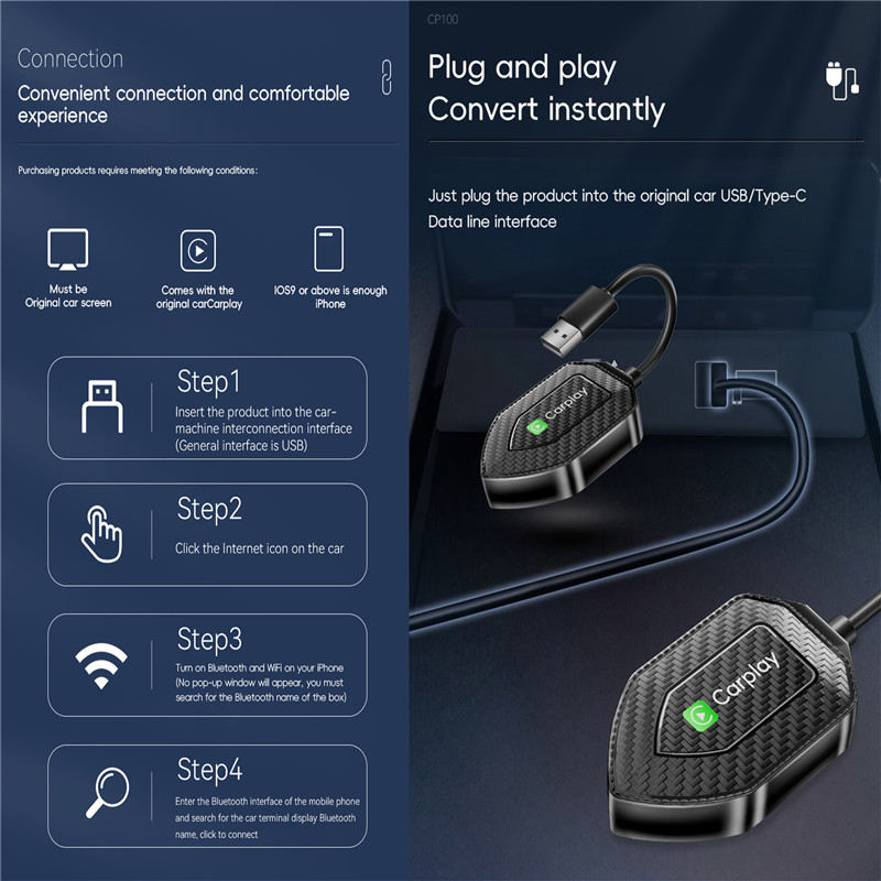 [CarPlay Wireless Adapter] Easy to convert your wired Carplay to wireless with Wireless CarPlay Dongle Your original car stereo will quickly get the APP on your phone supported by the current system, such as message, music, map, and realize the voice command like Siri, realize to operate Apps or control the car stereo.such as navigation, music playback, calls, etc.The small size of the wireless carplay adapter ensures it will not interfere with