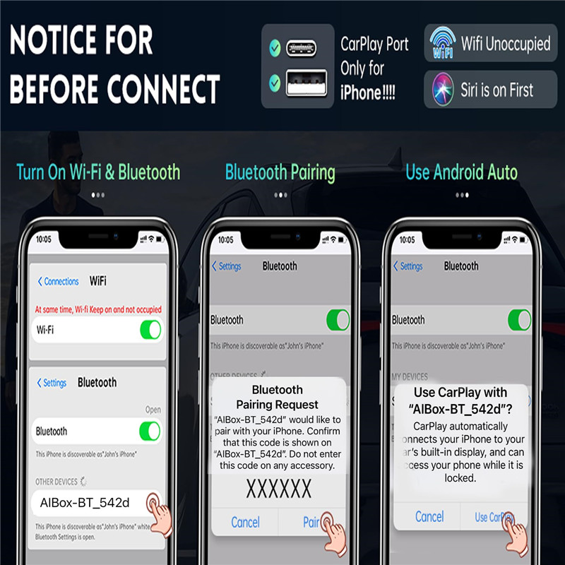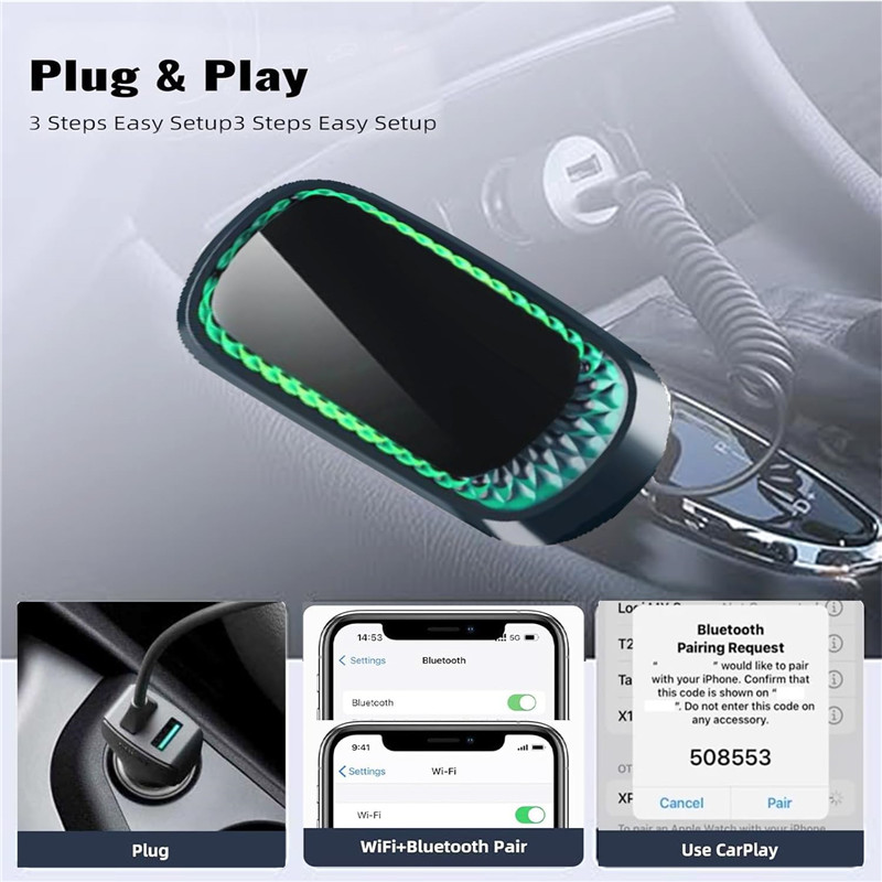 [Plug & Play] You could quickly and easily establish a connection in just three simple steps. Install our wireless adapter compatible with apple carplay into the USB hole, then turn on your phone's Bluetooth, connect to match the corresponding Bluetooth name, wait a few seconds and you'll be logged into the CarPlay interface.After finish the first setup, the adapter will automatically activate the connection every time the car starts. Whether you need turn-by-turn directions, want to stream your favorite songs, or catch up on the latest podcasts,Take the wheel and experience the convenience and fun of CarPlay with our top-of-the-line CarPlay Wireless Adapter